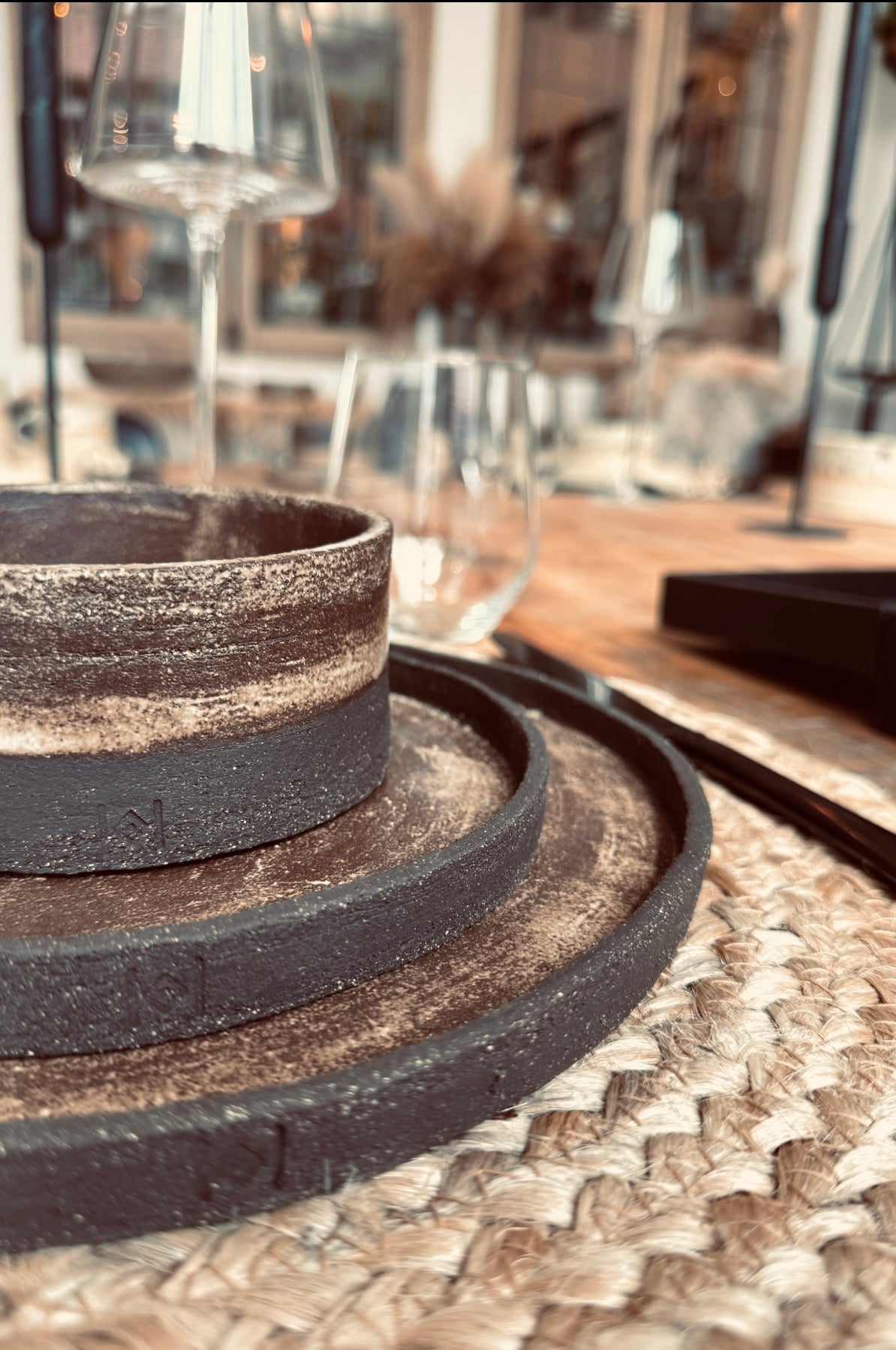 "Earth" is een krachtige, ambachtelijke keramiekcollectie van donkerbruine tot bijna zwarte klei met een matte witte afwerking. Het subtiele doorschijnende effect van de donkere klei geeft elk stuk een unieke, diepe uitstraling. Earth brengt een robuuste en natuurlijke sfeer op tafel en past perfect bij een industrieel of warm interieur.