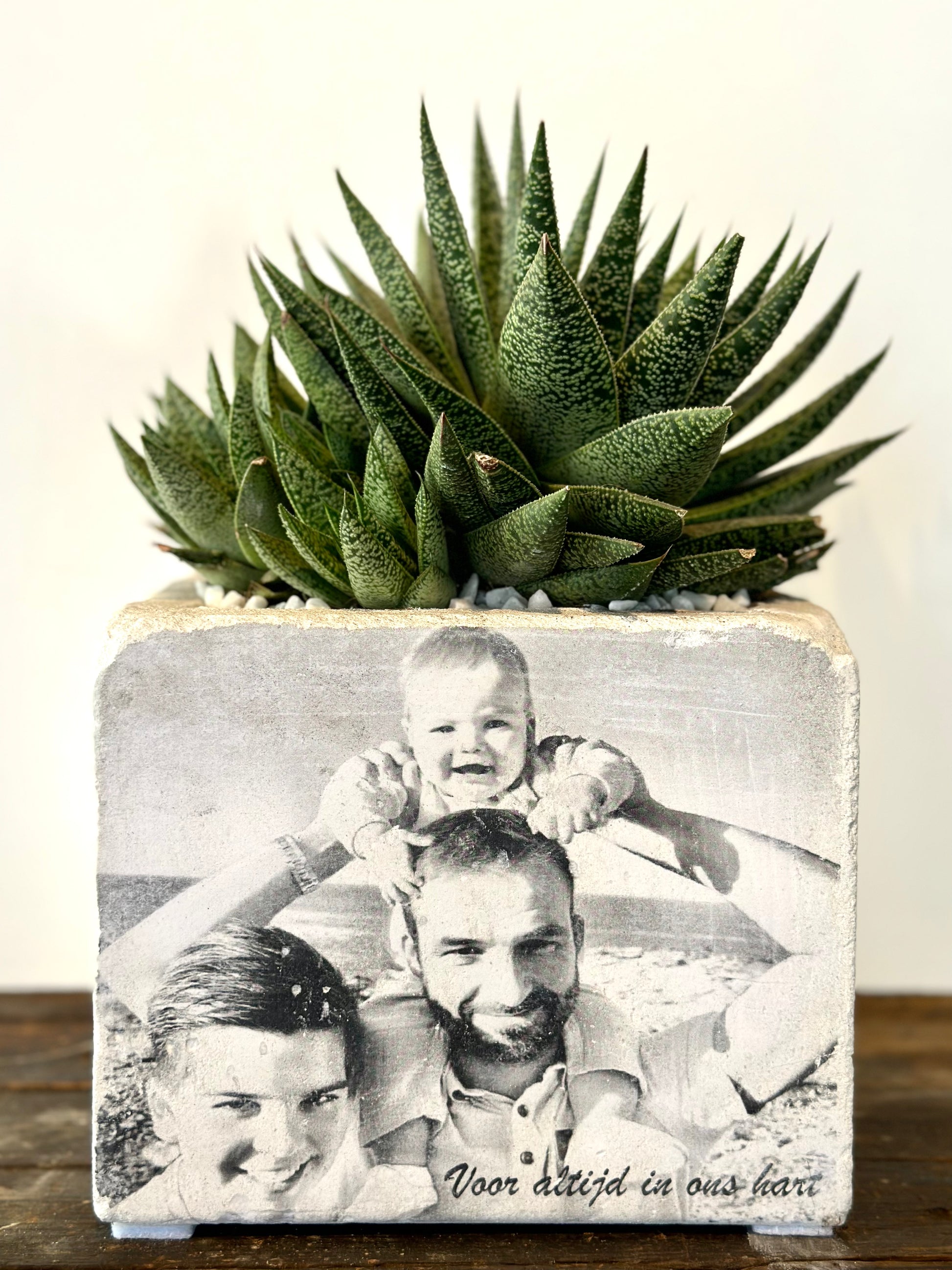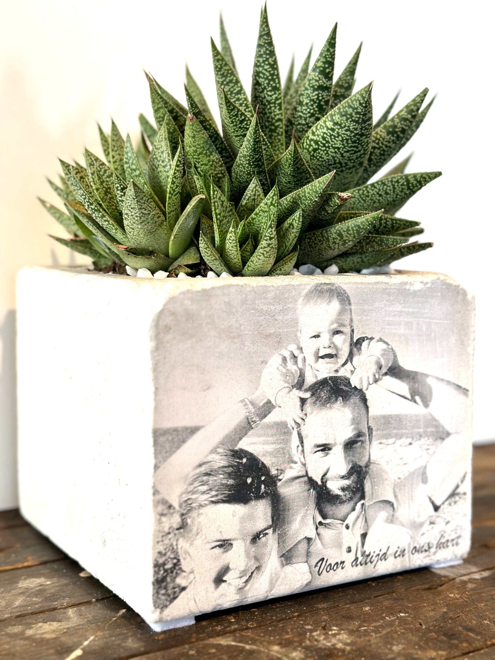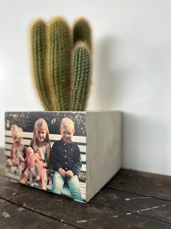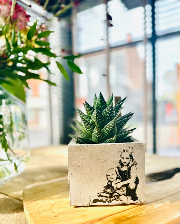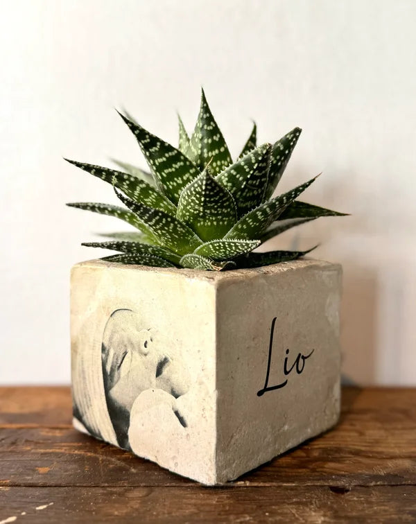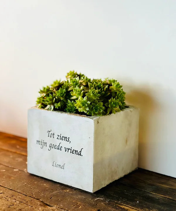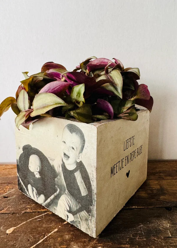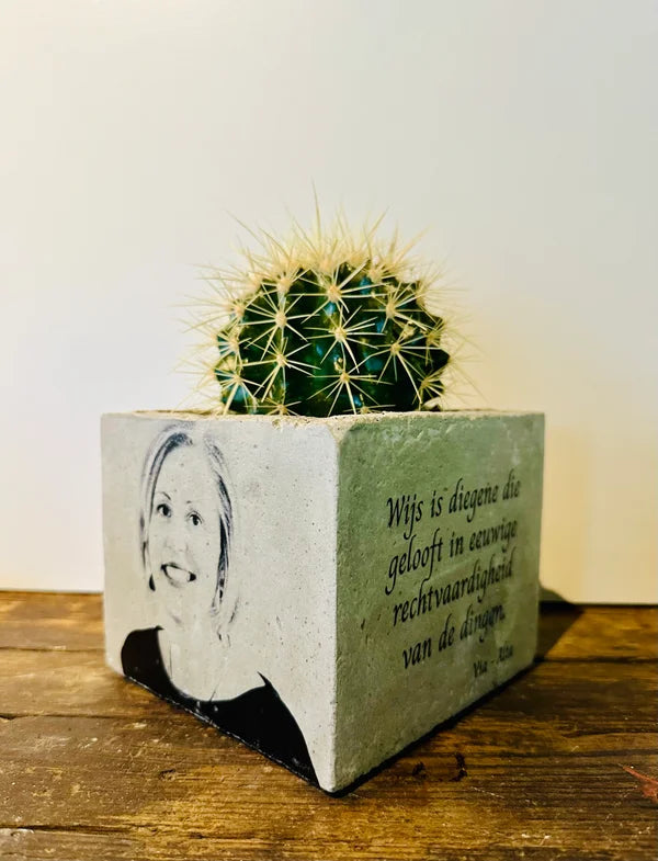 Beton bloempot met afbeelding/tekst naar keuze.