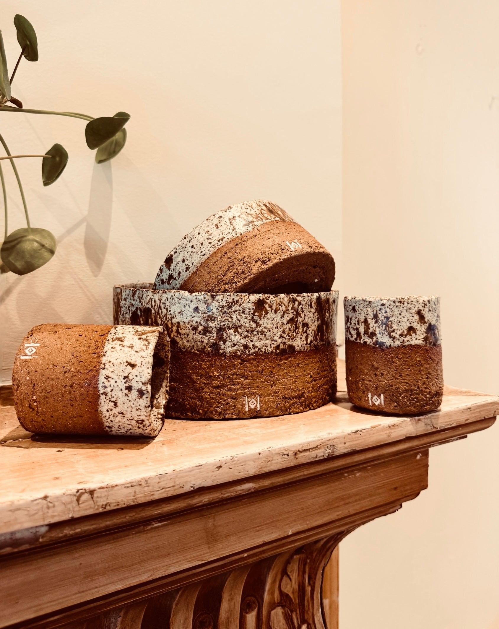 "Rock" is een robuuste keramiekcollectie van bruine klei met matte witte glazuur. Het doorschijnende effect van de klei maakt elk stuk uniek. Elk bord, mok, schaal is met de hand gemaakt en geschilderd. "Rock" brengt een robuuste, natuurlijke en boho-geïnspireerde sfeer op tafel, perfect voor een industrieel of warm interieur.