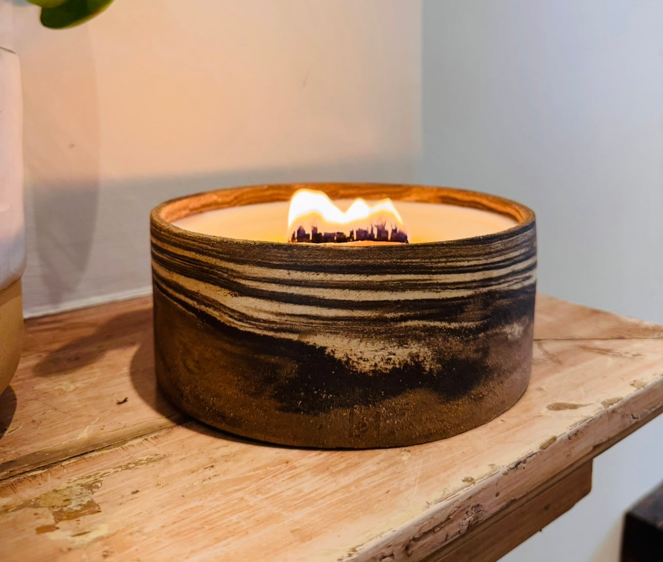 Luna is een verfijnde collectie handgegoten geurkaarsen in een bijzondere effectenklei met subtiele schakeringen — een harmonie tussen klei, hout en licht. Elke houder heeft een eigen patroon, waardoor geen twee kaarsen ooit hetzelfde zijn.