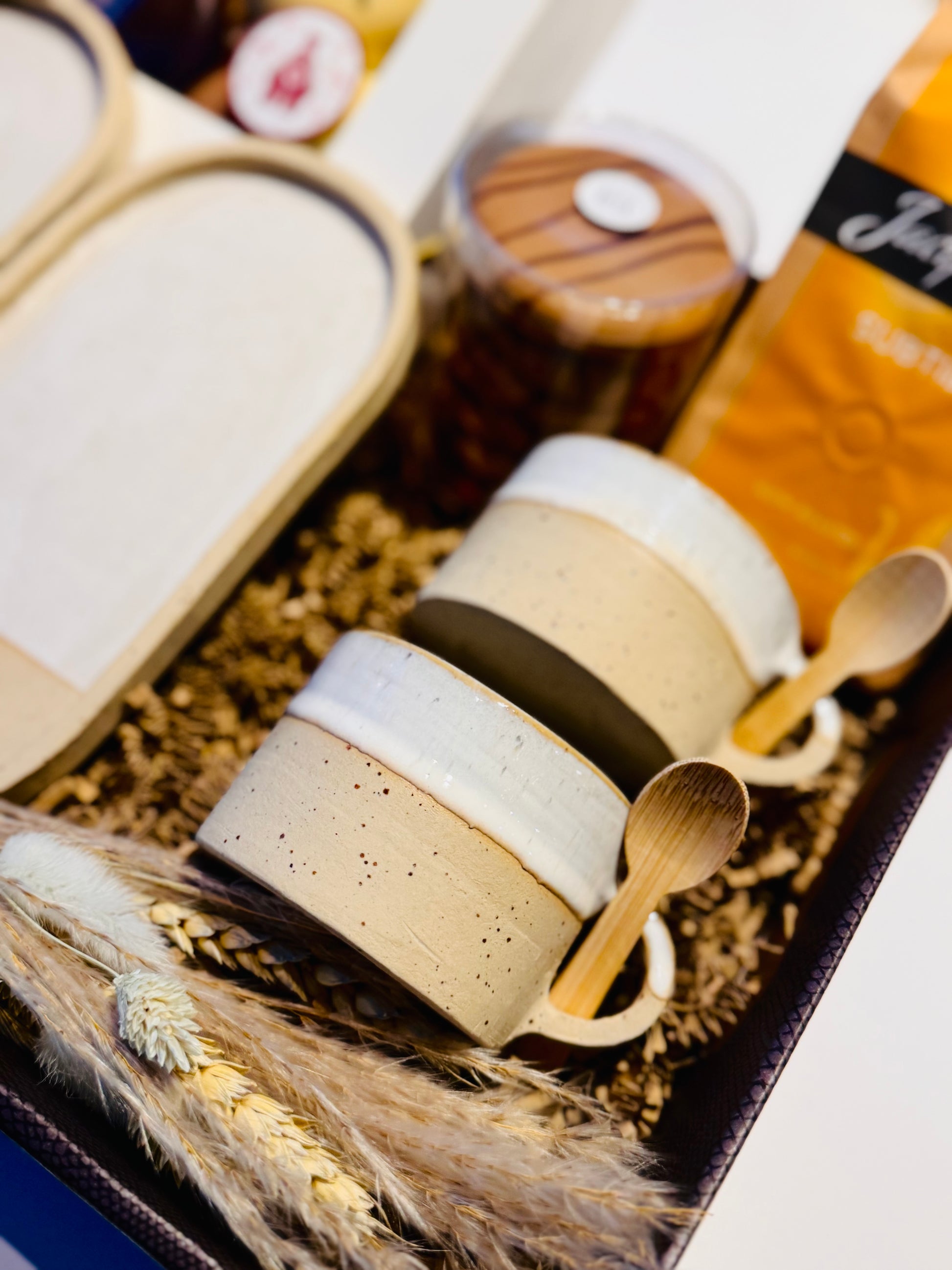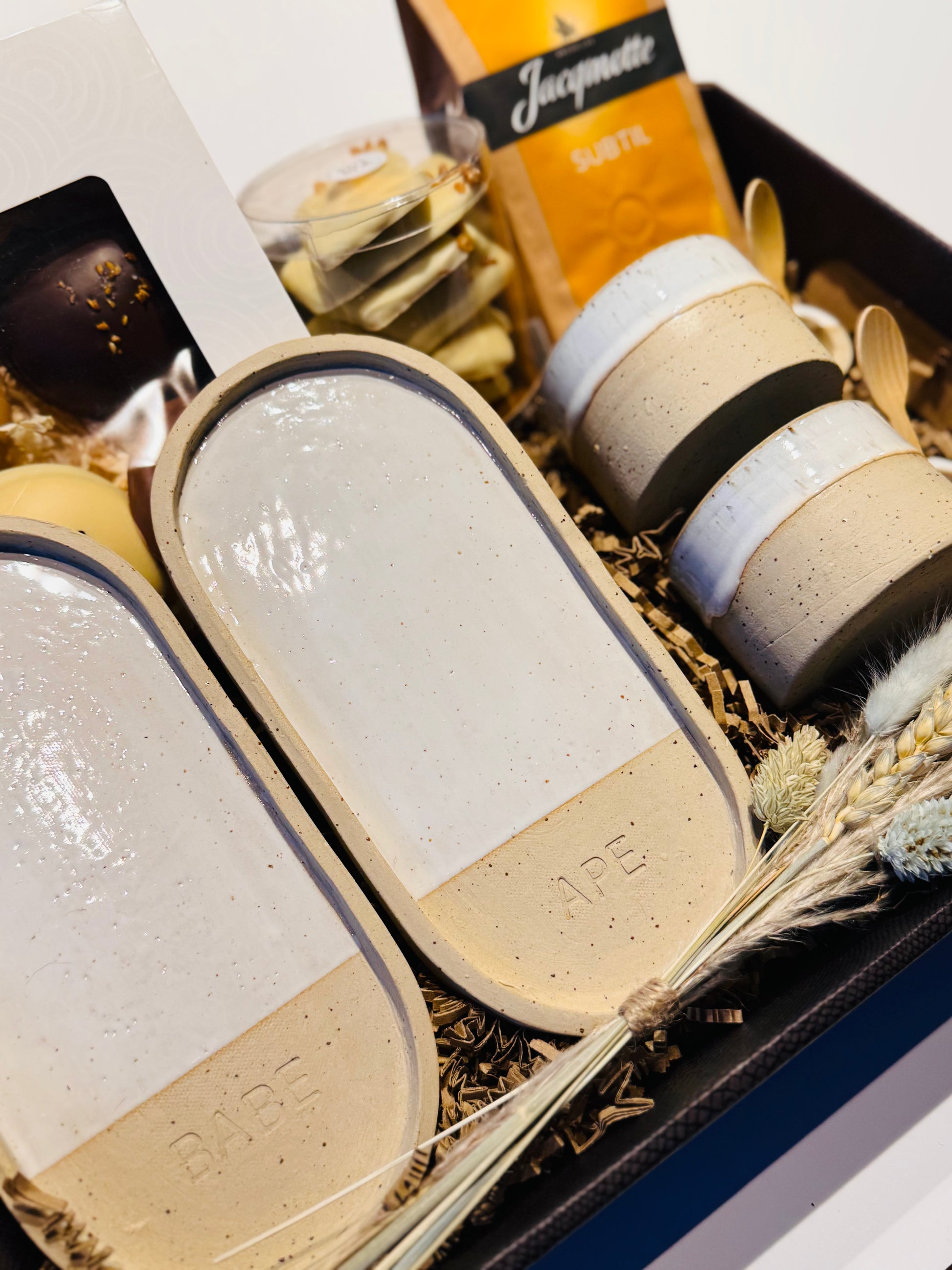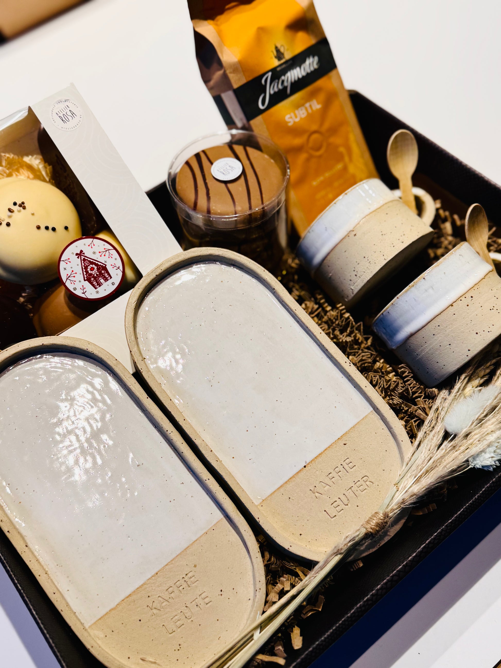 De box combineert handgemaakte keramiek met ambachtelijke chocolade van "Atelier Rosa" — het perfecte geschenk voor wie houdt van gezelligheid, warmte en iets unieks.
