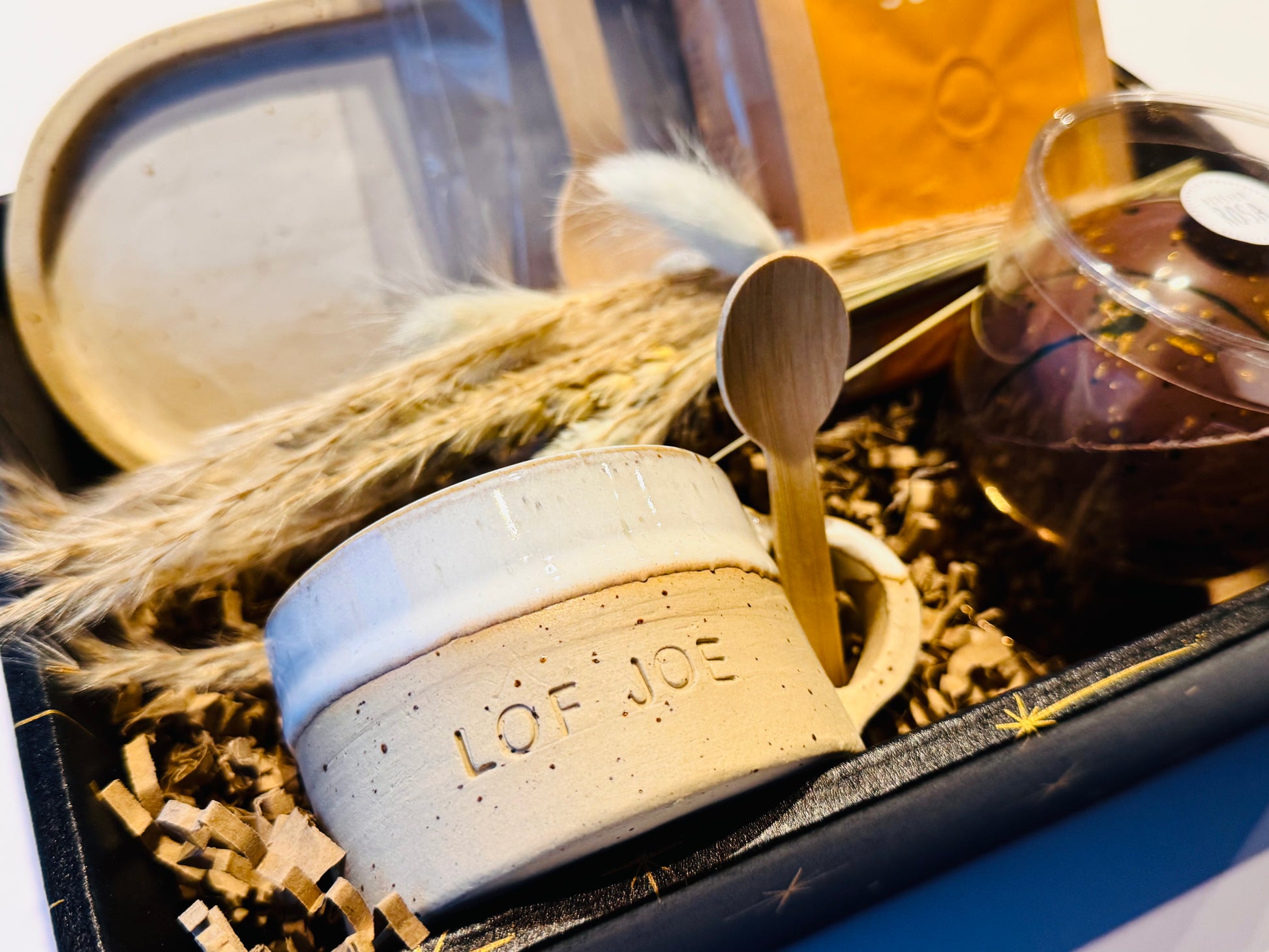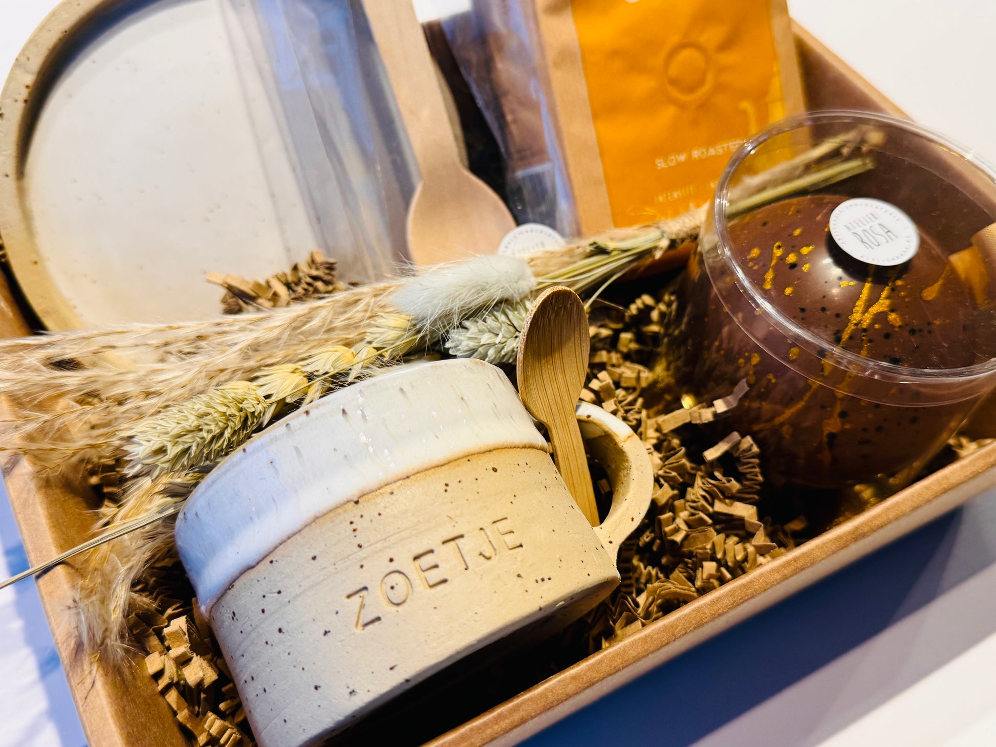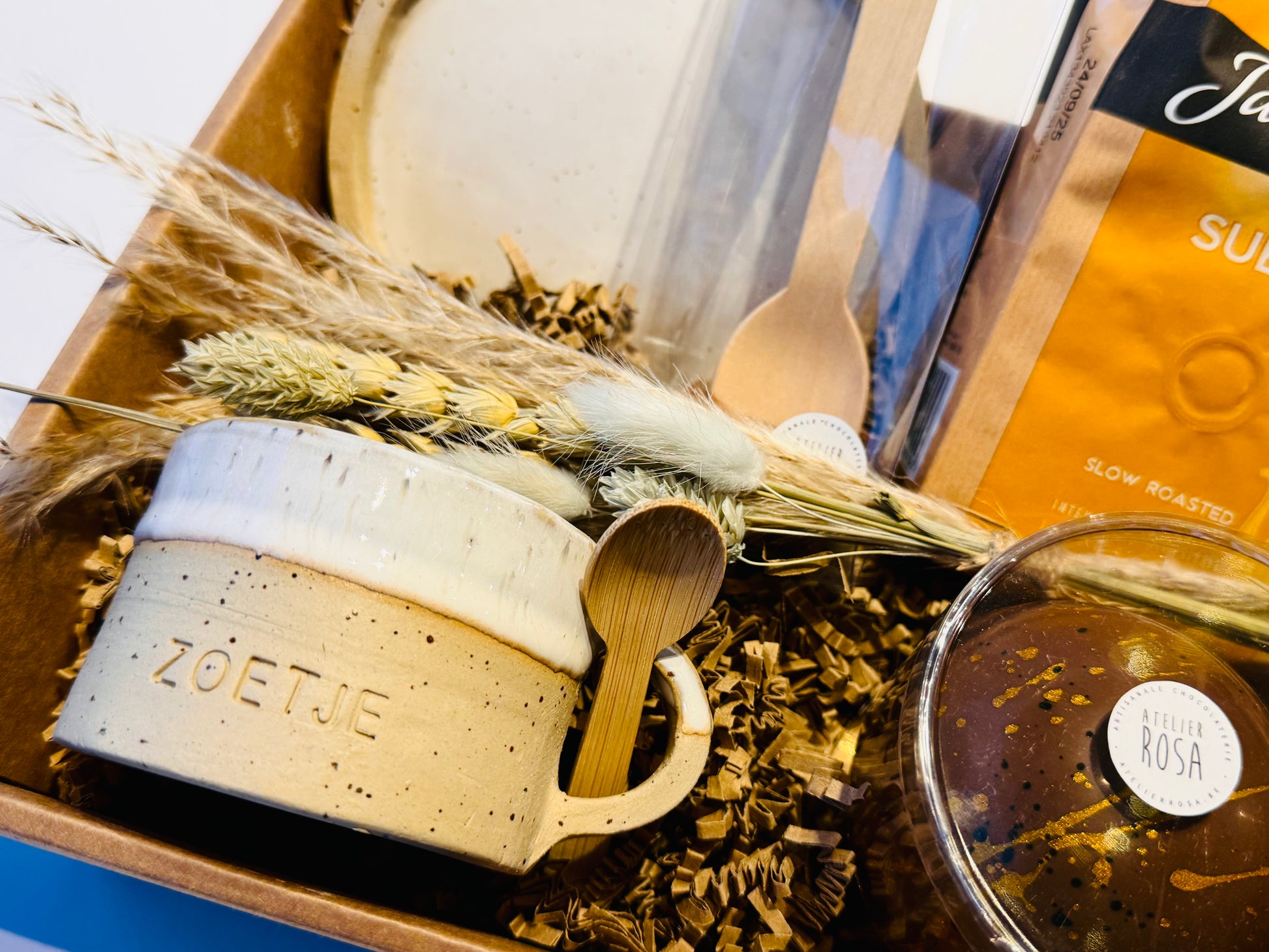 De box combineert handgemaakte keramiek met ambachtelijke chocolade van "Atelier Rosa" — het perfecte geschenk voor wie houdt van gezelligheid, warmte en iets unieks.